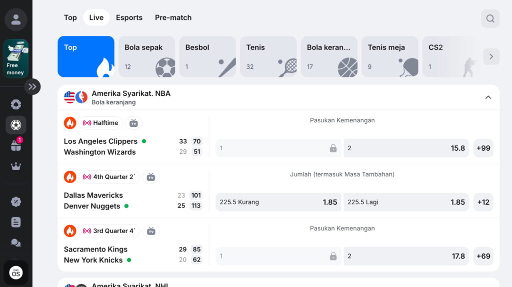 - Kepelbagaian Sukan yang Luas β Bertaruh ke atas lebih 50 jenis sukan, daripada arus perdana seperti bola sepak dan MMA hinggalah ke pilihan niche seperti polo air dan pesΓ€pallo.